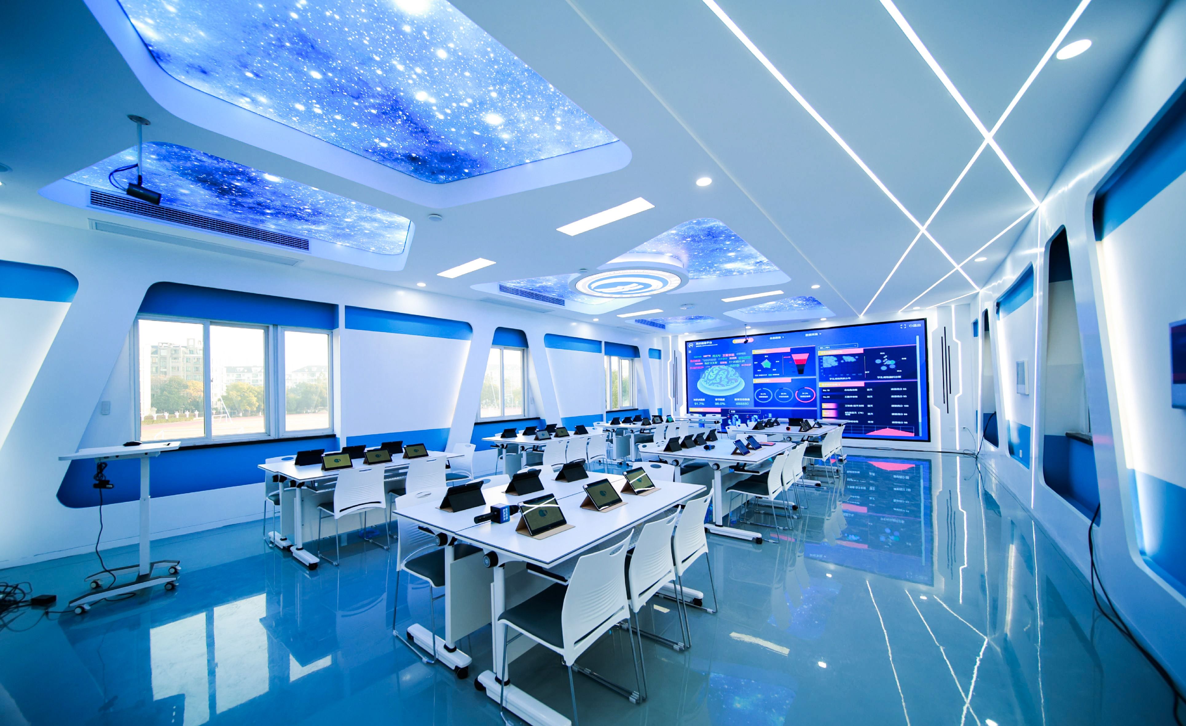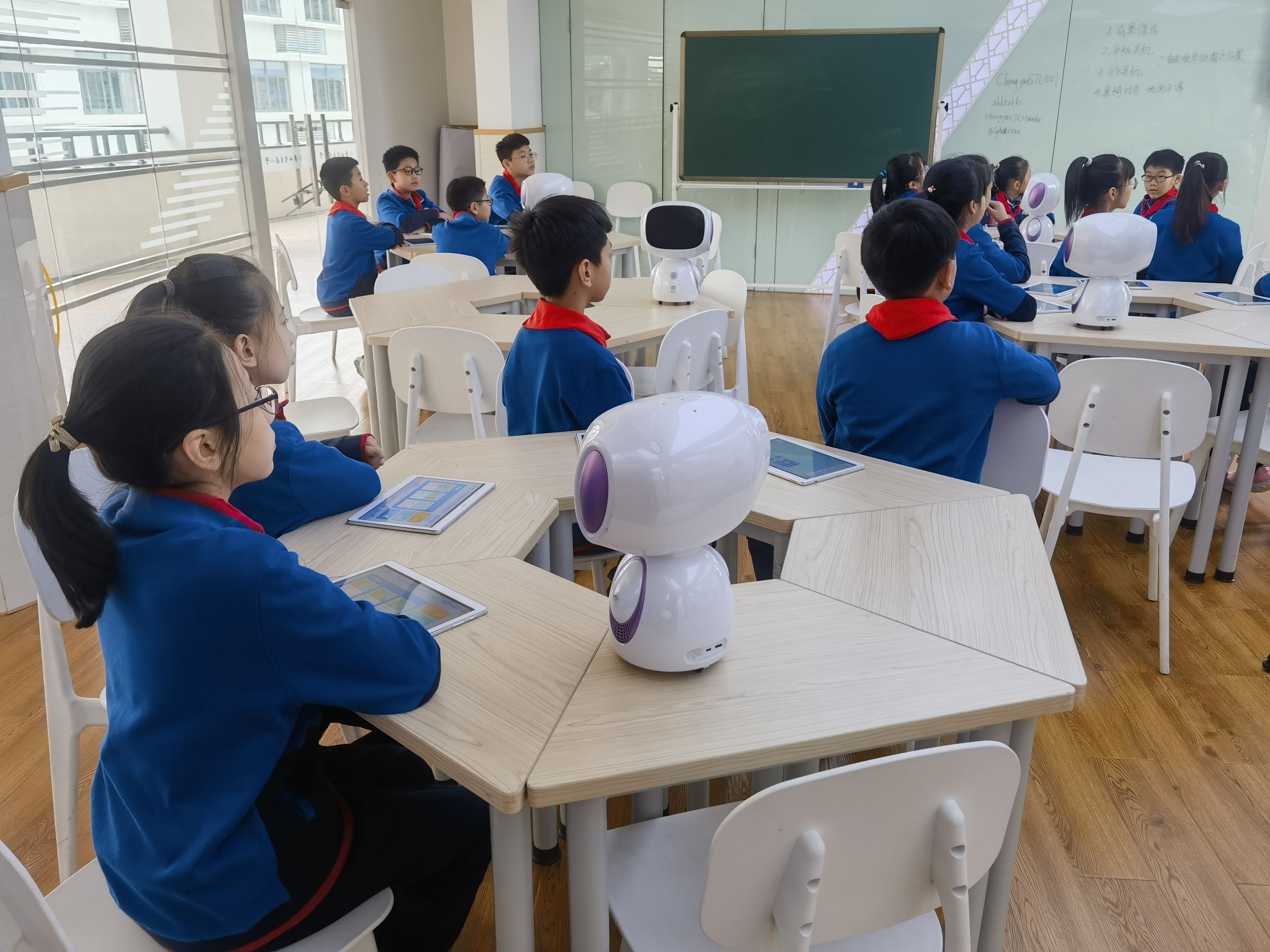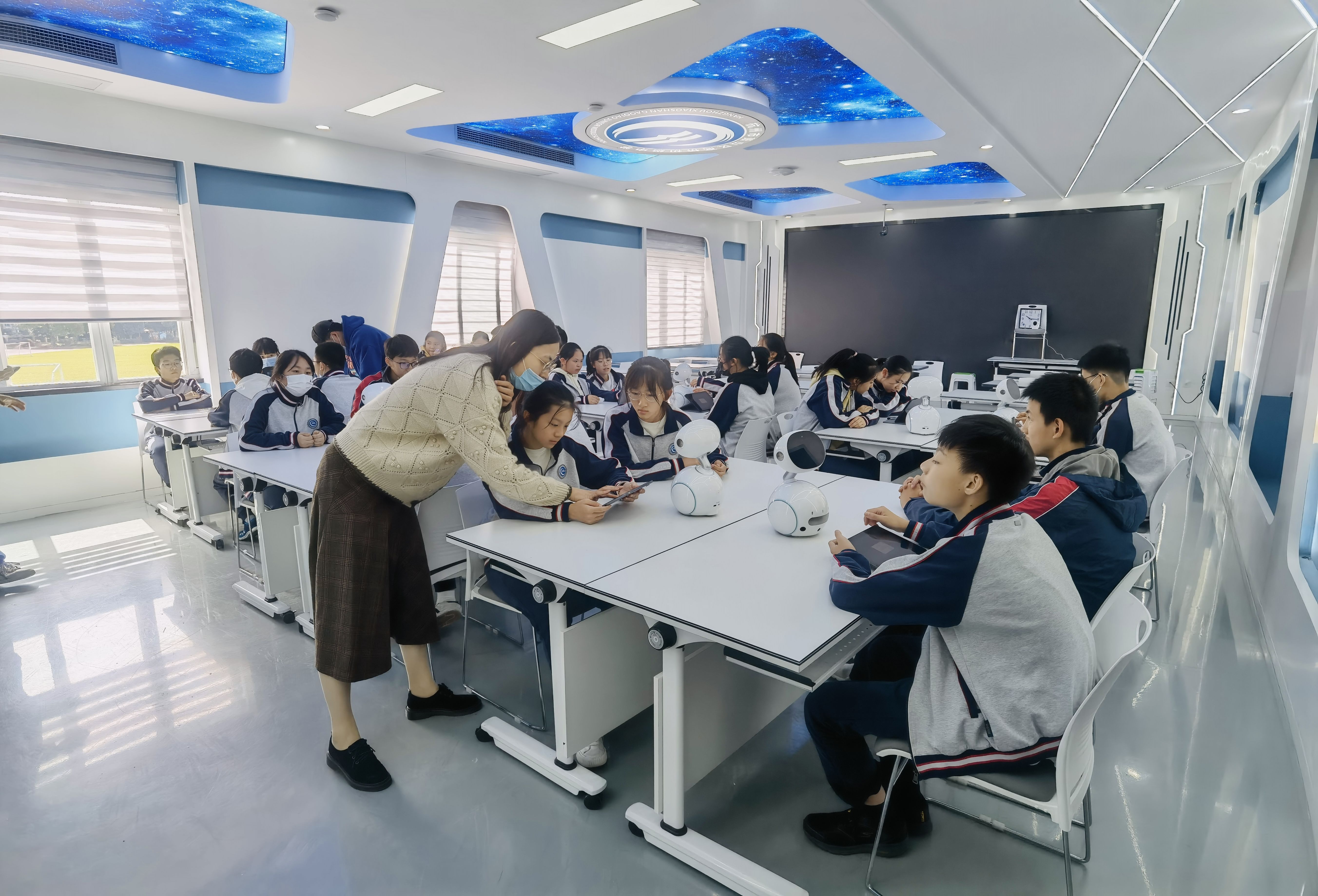 在萧山区高桥初中,人工智能实验室已经成为深受学生们喜爱的网红教室。颇具神秘感的星空顶、俏皮可爱的机器人、触控操作的电子黑板、可随意组合的课桌椅……一体化人工智能演示设备,让教室里满满的科技感。